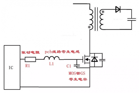 在圖2中,IC出來(lái)的波形正常,到C1兩端的波形就有振蕩了。實(shí)際上,這個(gè)振蕩就是R1、L1、C1三個(gè)元器件的串聯(lián)振蕩引起的。其中,R1為驅(qū)動(dòng)電阻,是我們外加的;L1是PCB上走線(xiàn)的寄生電感;C1是MOS管GS的寄生電容。