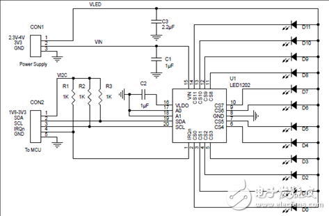 ST公司的LED1202是12路低靜態(tài)電流LED驅(qū)動(dòng)器,保證了5V輸出驅(qū)動(dòng)功能,而每路能提供高達(dá)20 mA和電壓裕度僅為350mV.每路的輸出電流由8位模擬和12位數(shù)字調(diào)光控制來(lái)單獨(dú)調(diào)整.慢開時(shí)間和慢關(guān)時(shí)間提高了系統(tǒng)的低噪音性能,而移相功能有助于降低浪涌電流,八種模式存儲(chǔ)在內(nèi)部寄存器而不需要MCU干預(yù)進(jìn)行自動(dòng)定序.器件的1.8V兼容的I²C接口基于快速模式指標(biāo),工作高達(dá)400kHz.工作電壓2.6V-5V,每路的電流能力20mA,16mA時(shí)的12路的電流匹配度1%,2.5mA時(shí)的匹配度2%,8位模擬調(diào)光單獨(dú)控制,12位本地PWM分辨率.LED1202具有LED開路檢測(cè)和超溫保護(hù).主要用在RGB照明如可穿戴電子學(xué),電池供電設(shè)備和手持附件.本文介紹了LED1202主要特性,框圖和驅(qū)動(dòng)器電路框圖,以及評(píng)估板STEVAL-LLL007V1主要特性,電路圖和材料清單.