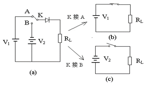 V1為外加電源電壓,VJ為二極管的正向壓降,對(duì)硅管VJ約為0.7V,鍺管VJ約為0.25V,RL為負(fù)載電阻。