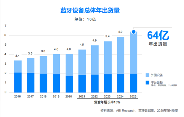 ・強勁復(fù)蘇將推動藍牙設(shè)備年出貨量到 2025 年達到 64 億;