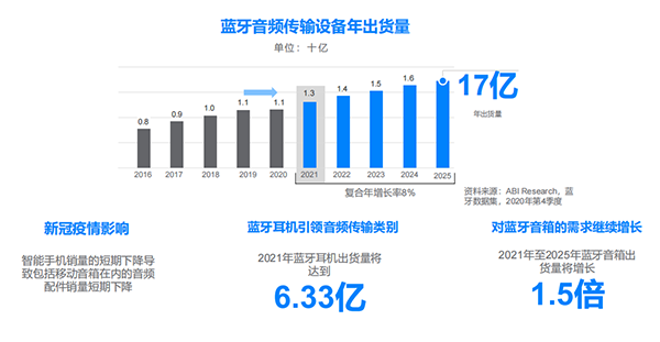 受新冠疫情影響,智能手機銷量的短期下降,導(dǎo)致了包括移動音箱在內(nèi)的音頻配件銷量短期下降。2020 年藍牙音頻傳輸設(shè)備的年出貨量為 11 億,與上一年持平。但即便如此,藍牙耳機仍然引領(lǐng)了藍牙音頻傳輸類設(shè)備的出貨量,2021 年藍牙耳機出貨量將達到 6.33 億,幾乎占整體市場的一半。與此同時,對藍牙音箱的需求將持續(xù)增長,2021-2025 年藍牙音箱出貨量將增長 1.5 倍。根據(jù)預(yù)測,整體藍牙音頻傳輸設(shè)備的年出貨量到 2025 年將達到 17 億。