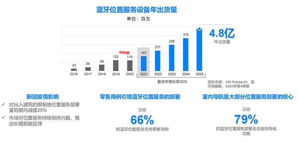 報告顯示,為減緩疫情傳播速度,在疫情期間,專業(yè)人員被禁止出差,以至于無法在設(shè)施內(nèi)安裝設(shè)備位置服務(wù),導(dǎo)致位置服務(wù)部署速度相較 2020 年疫情前的預(yù)期減緩了 25%。但是,預(yù)計整個 2021 年該市場的增長速度將恢復(fù)到疫情前水平,2021 年底,藍牙位置服務(wù)部署總量將達到 26.2 萬,至 2025 年部署量將上升到 55 萬。