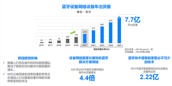 受疫情的影響,人們待在家中的時間明顯增加,這推動了家居自動化解決方案銷量的增長。同時,對辦公室用途和效率的重新思考,正在增加人們對具備雙重作用的互聯(lián)照明系統(tǒng)的關(guān)注。這將推動設(shè)備網(wǎng)絡(luò)設(shè)備在未來五年實現(xiàn) 34% 的復(fù)合年增長率,根據(jù)報告預(yù)測,2021 年藍牙設(shè)備網(wǎng)絡(luò)設(shè)備的出貨量將達到 2.7 億。2021 年至 2025 年藍牙設(shè)備網(wǎng)絡(luò)設(shè)備年出貨量將增長 4.4 倍。