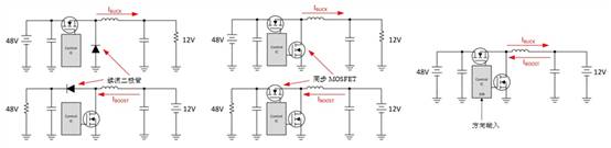 意識到48V電源軌和12V電源軌的電壓范圍從不重疊大大降低了設(shè)計(jì)復(fù)雜性。對于從48V電源軌到12V電源軌的電源傳輸,可以使用降壓轉(zhuǎn)換器,而使用升壓轉(zhuǎn)換器可實(shí)現(xiàn)12V至48V電源軌方向的電源傳輸。由于千瓦級功率要求,每個轉(zhuǎn)換器應(yīng)使用同步MOSFET代替續(xù)流二極管,以提高系統(tǒng)效率。
