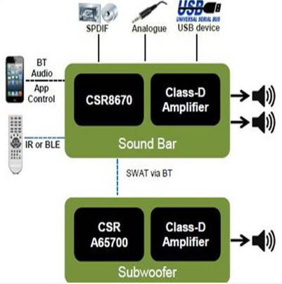 高為技術的聲霸方案,采用最新藍牙4.1標準的CSR 8670芯片方案,利用芯片內(nèi)部強勁的DSP處理能力,加入音效處理技術和aptX高保真,低延時技術,有效的解決了音視頻信號時間同步的問題,同時低音炮部分的聲音也是透過藍牙進行傳輸。另外利用芯片內(nèi)部的超低功耗藍牙,并引入超低功耗藍牙遙控器,將整個系統(tǒng)都整合起來,系統(tǒng)設計,生產(chǎn)都非常簡單,而功能確異常的強大。