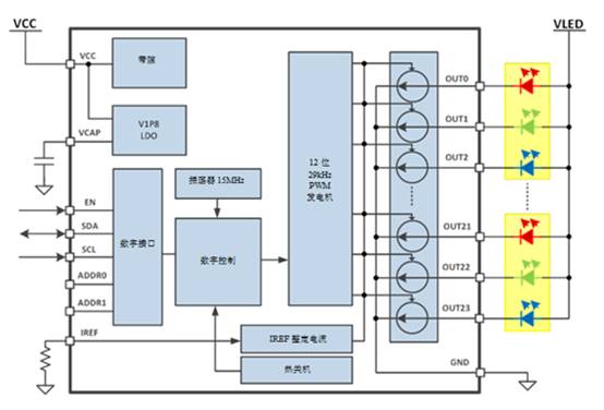 • 高分辨率脈沖寬度調(diào)制(PWM)控制,用于改變LED的亮度,但又不會(huì)過(guò)于有臺(tái)階變化的視覺(jué)感受。
