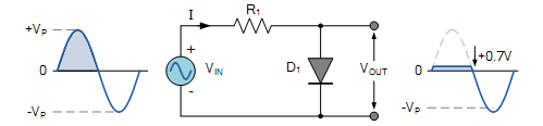 如下圖所示,當(dāng)在正半周期,并且VIN大于等于0.7V,二極管正向?qū)。此時,VOUT會被鉗位在0.7V上。