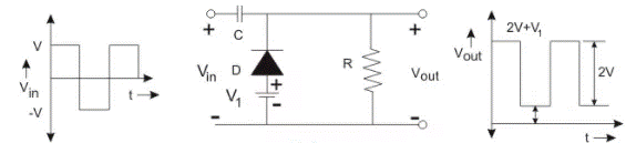 當(dāng)所加的偏壓與二極管導(dǎo)通方向一致,鉗位值會提高V1,Vout=2V+V1。