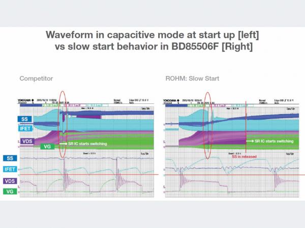 圖6:?jiǎn)?dòng)時(shí)處于電容模式的波形[左]以及BD85506F的慢啟動(dòng)行為[右](圖片來源:ROHM)