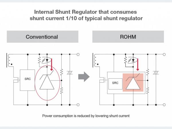 圖7:與傳統(tǒng)并聯(lián)穩(wěn)壓器相比,ROHM的內(nèi)部并聯(lián)穩(wěn)壓器的并聯(lián)電流僅為十分之一(圖片來源:ROHM)