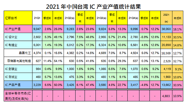 根據(jù)最新預(yù)測,2021年臺灣IC產(chǎn)業(yè)產(chǎn)值達1285億美元,較2020年成長18.1%。