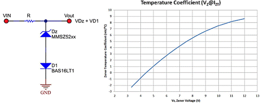 圖1顯示了在齊納二極管電路中串聯(lián)一個(gè)二極管,曲線繪制了齊納二極管的不同電壓對(duì)應(yīng)的溫度系數(shù)。當(dāng)穩(wěn)壓二極管電壓大于4.7V時(shí),溫度系數(shù)逐漸變?yōu)檎龜?shù),因此當(dāng)工作溫度升高時(shí),齊納二極管電壓隨之升高。如果與溫度系數(shù)為負(fù)值的二極管配對(duì),通過(guò)降低二極管正向電壓,齊納二極管增加的電壓會(huì)被抵銷,從而消除溫度誤差。
