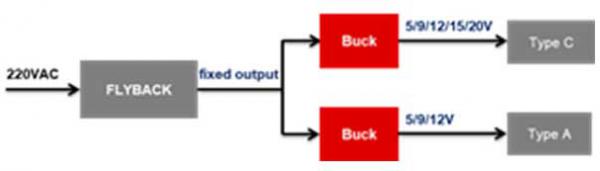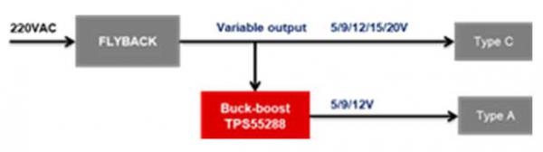 以65W的1A1C充電頭為例,如下圖所示,傳統(tǒng)方案通常采用兩路Buck架構(gòu),flyback輸出固定電壓作為Buck輸入。而采用升降壓方案,則可省去一路DC/DC電路, flyback輸出可調(diào)節(jié)電壓,直接給Type C端口提供電壓;同時(shí)通過TPS55288給Type A端口提供電壓,這樣可以簡化電路,減小產(chǎn)品的體積。