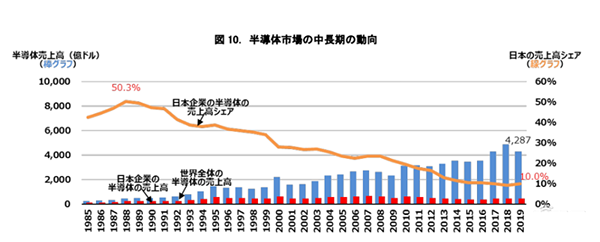 增長戰(zhàn)略草案首先提到,日本半導(dǎo)體產(chǎn)業(yè)較之前有所衰落。日本增長戰(zhàn)略委員會(huì)在草案中寫道,1988 年,日本在全球半導(dǎo)體市場的銷售份額為 50% 左右;2019 年,這一比例已經(jīng)降到了 10%。