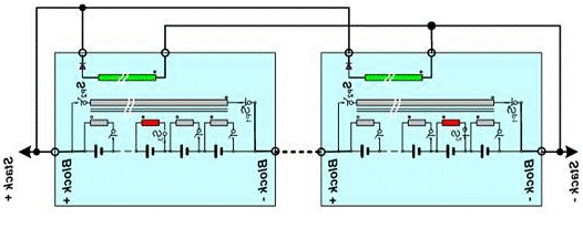 鋰電池儲能能力強(qiáng),但單個電池的電壓和電流都太低,不足以滿足混合動力電機(jī)的需要。為增加電流需將多個電池并聯(lián)起來,為獲得更高的電壓,則要把多個電池串聯(lián)起來。單個鋰電池的電壓一般介于3.3~3.6V之間。例如,將多達(dá)12 個電池串聯(lián)組成一個電池塊(block)輸出電壓介于30~45V 之間,而混合動力汽車驅(qū)動需要336V左右的直流電源電壓,因此通常需要8-10個電池塊(block)串聯(lián)起來使用,意味著電動汽車的電池組是數(shù)量眾多的的單體電池組成(100節(jié)以上)。