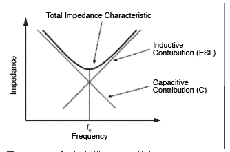 如果 C1 為理想電容,則阻抗特性會(huì)隨著頻率的提升而下降(XC = 1/[2π x f x C])。但是,實(shí)際應(yīng)用中并不存在理想電容。非理想電容模型(圖 1B)的阻抗在自諧振頻率*下陷,然后隨著頻率開始上升。當(dāng)頻率大于 fo 時(shí),則電感分量開始增加(XL = 2π x f x L)。如果將電容作為濾波器使用,當(dāng)接近或高于其自諧振頻率時(shí),則此種特性將會(huì)令濾波效果變差。但是,如果選擇電容將特定的高頻分量旁路接地,則此時(shí)電容的自諧振特性就可以派上用場(chǎng)了。