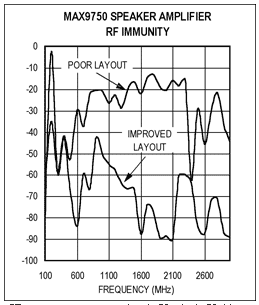 注:圖 2 給出了 MAX9750 IC 的典型 RF 抑制能力。天線信號(hào)強(qiáng)度、電纜長(zhǎng)度及揚(yáng)聲器類型等一些外部因素也會(huì)影響 RF 抑制性能。