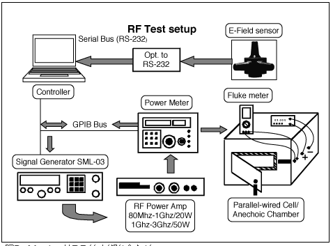 利用計(jì)算機(jī)設(shè)置信號(hào)發(fā)生器輸出的頻率范圍、調(diào)制比和調(diào)制類型,以及 RF 功率放大器的功率輸出。調(diào)制信號(hào)被饋送到相應(yīng)的功率放大器(OPHIR 5124:20MHz 至 1000MHz,20W 或 OPHIR 5173:1GHz 至 3GHz,50W),并通過定向耦合器和功率計(jì)測(cè)量并監(jiān)視放大器的輸出。所定義的 RF 場(chǎng)在測(cè)試室內(nèi)均勻輻射。