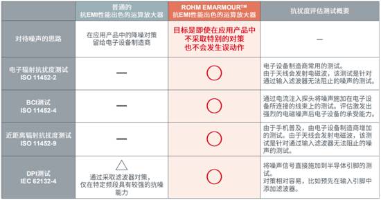 EMARMOUR產(chǎn)品通過了包括“電子輻射抗擾度測試 ISO 11452-2”、“BCI測試 ISO 11452-4”、“近距離輻射抗擾度測試 ISO 11452-9”、“DPI測試 IEC 62132-4”四項國際通行的抗擾度評估測試。朱莎勤介紹道,普通的抗EMI運算放大器一般僅做“DPI測試”,通過采取濾波器對策,僅在特定頻段具有較強(qiáng)的抗噪能力。而羅姆希望簡化工程師針對EMC的設(shè)計,同時也確保產(chǎn)品更加穩(wěn)定,因此通過了四項測試以實現(xiàn)更好的抗干擾性。