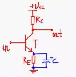 b、由于Cbc的存在,當(dāng)輸入信號的頻率過高時,Vout的一部分會經(jīng)過Cbc反饋到基極,又因為此反饋信號和輸入信號有180°的相位差,所以,這樣也會降低基極的電位,電壓增益也由此下降。