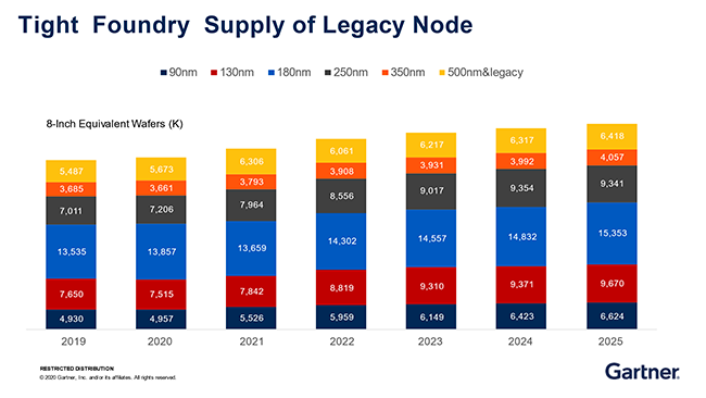 傳統(tǒng)制成大多數(shù)集中在8英寸晶圓,如今8英寸晶圓非常緊缺,源于早期8英寸建設高峰時期,過多的產(chǎn)能導致市場出現(xiàn)過剩,市場上長期低價競爭,加之很多企業(yè)陸續(xù)關閉了8英寸晶圓工廠,而設備廠商陸續(xù)全線轉(zhuǎn)向12英寸,晶圓廠無法提高8英寸產(chǎn)能。此外,5G手機對PMIC、模擬電路需求量激增,大部分為8英寸晶圓,如此以來,需求與產(chǎn)能的供需不平衡,導致8英寸制成緊缺的局面。盛陵海指出,目前8英寸產(chǎn)線沒有新廠的投資,大多數(shù)均為擴產(chǎn),實際是為了滿足增加的迫切需求,但要徹底解決8寸制成緊缺的問題,仍需要將8寸的產(chǎn)能轉(zhuǎn)向12寸。