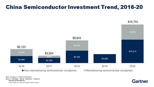 根據(jù)Gartner公開的資料顯示,中國半導體企業(yè)以及相關企業(yè)獲得投資規(guī)模主要來源于非生產(chǎn)型的半導體公司和生產(chǎn)型的半導體公司。近兩年間,“非生產(chǎn)型的半導體公司”融資已有非常大的提升,如GPU公司。此外,自動駕駛和“寬禁帶半導體”的投資規(guī)模也逐步增加,像華為、小米以及英特爾、高通、三星等海外企業(yè)在中國國內(nèi)積極投資。對于生產(chǎn)型企業(yè),規(guī)模和數(shù)量都有所增加。此外,科創(chuàng)板的出現(xiàn)帶動了整個投資熱潮,讓很多的投資逐漸集中于半導體產(chǎn)業(yè),如高瓴資本、紅杉資本等開始涉足半導體企業(yè),幫助了新興公司能盡快地進行產(chǎn)品創(chuàng)新或是利用最先進制成打造產(chǎn)品。