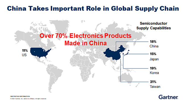 在國內(nèi)市場方面,中國實際上從五年前就已在半導體自由化方面付諸了行動。根據(jù)Gartner的預測,預計在2025年,國內(nèi)半導體公司市場份額,有望從15%突破到30%。如今的“缺芯”潮對于國內(nèi)半導體公司而言,創(chuàng)造了千載難逢的機會。