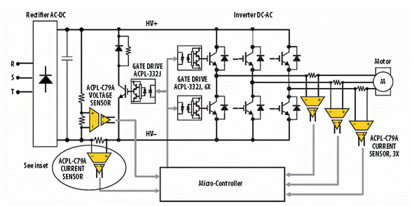 在逆變器中,IGBT 是最昂貴的組件,因此提供盡可能多的保護以保護它們免受損壞是有意義的。Avago iso-amps 提供故障條件的快速檢測,微控制器執(zhí)行的算法可以防止故障條件導致 IGBT 發(fā)生故障。此外,iso-amp 中的光學隔離可防止故障條件使微控制器過載并導致其發(fā)生故障。然而,IGBT 保護必須具有成本效益——市場繼續(xù)要求以不顯著影響電機驅(qū)動系統(tǒng)總成本的成本為故障條件提供足夠的 IGBT 保護。為了滿足這一需求,IGBT 柵極驅(qū)動器(例如 ACPL-332J1) 和具有保護功能的電流傳感器已被引入,除了它們的驅(qū)動和傳感功能外,還可以執(zhí)行基本的故障檢測。這些產(chǎn)品提供了一種具有成本效益的方案來實施 IGBT 保護,并且無需單獨的檢測和反饋組件。有關(guān)與 Avago 柵極驅(qū)動器集成的保護功能以及如何在 IGBT 保護應用中使用這些功能的詳細信息,請參閱參考文獻 [2、3]。本文的其余部分將重點介紹可以使用表 1 中列出的電流/電壓傳感器實現(xiàn)的一些故障保護功能。 |