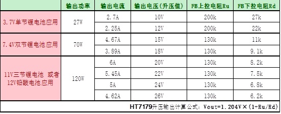 4.單節(jié)/雙節(jié)/三節(jié)鋰電或者鉛酸電池應用升壓輸出電壓/功率以及對應FB管腳設置電阻值: