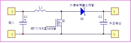 HT7179內(nèi)部集成15A的MOS開關管,外圍除了必須的電感之外,關鍵器件就是肖特基二極管。原理上是一種常見的開關直流boost升壓DC-DC電路,它通過開關管導通和關斷來控制電感儲存和釋放能量,從而使輸出電壓比輸入電壓高。基本的工作原理如下: