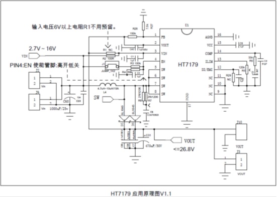 HT7179輸入電壓最低到2.7V,升壓輸出最高到26.8V。開關頻率固定350kHz,峰值電流可通過外圍電阻編程最大15A。支持低EMI工作模式,方便靈活。采用eSOP-16封裝,加上完善的輸出過壓,過熱保護,指標以及可靠性非常出色。HT7179是替代26V/100W左右