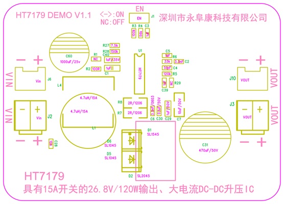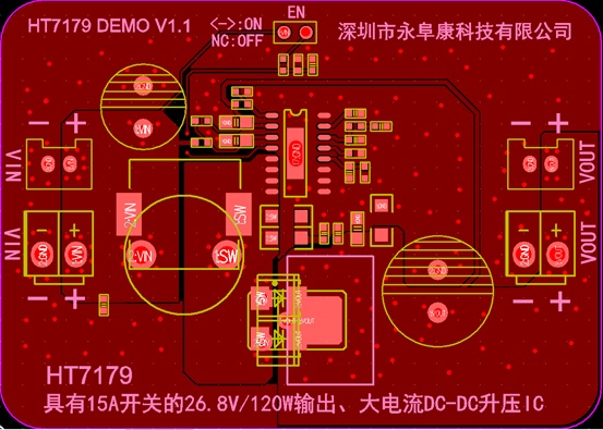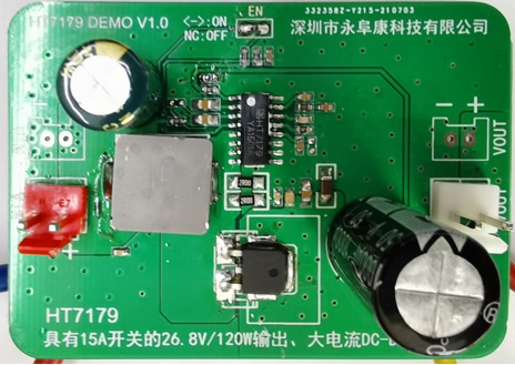 深圳市永阜康科技有限公司針對大功率的DC-DC升壓應用需求,推廣一款集成15A開關管的26.8V、120W輸出、大電流非同步DC-DC升壓IC-HT7179。HT7179采用獨到的電路研發(fā)技術以及先進的半導體工藝,重載時高達93%以上的工作效率,無需外加散熱器,升壓到26.8V,可穩(wěn)定輸出120W。