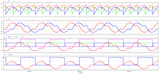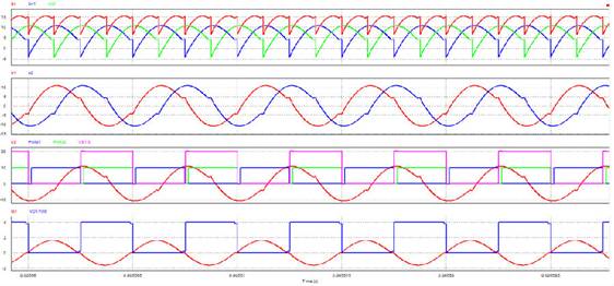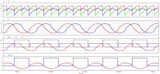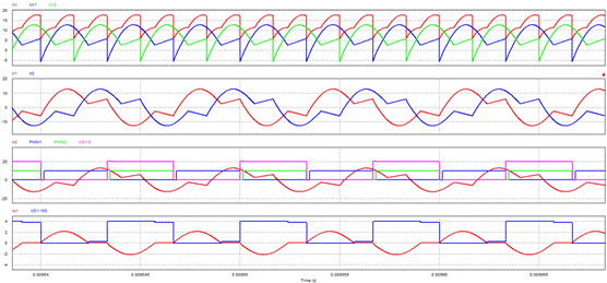 上述 圖中可以看出前級(jí)開關(guān)管均實(shí)現(xiàn)了ZVS,副邊實(shí)現(xiàn)了ZCS(圖4中情況除外),半橋相位關(guān)系如圖5所示。
