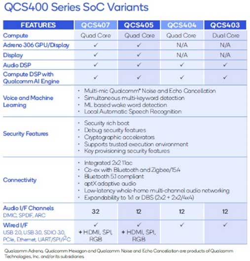 該家族目前擁有QCS403、QCS404、QCS405、QCS407。其中,QCS403/404分別搭載雙核/四核CPU,兩者都支持藍牙5.1;QCS405包含四核CPU,并支持高通AI引擎(或平臺),可以使用四核CPU、GPU和雙DSP來完成AI推論;QCS407則在QCS405的版本上為AV接收器提供更多音頻通道。