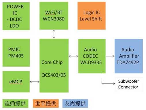 大聯(lián)大詮鼎基于QCS400系列SoC,再搭配PM405電源管理IC及WiFi前端IC - WCN3980,組成高性價比方案的智能音響參考設(shè)計方案。