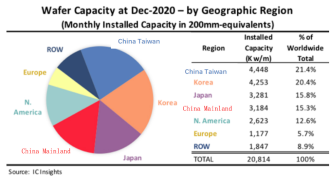 半導體市場研究機構IC Insights公布了2021-2025年全球晶圓月產(chǎn)能報告(按地理區(qū)域劃分)。截至2020年12月,中國臺灣地區(qū)的晶圓月產(chǎn)能達444.8萬片,占全球晶圓產(chǎn)能的21.4% ,排名第一;排在第二位的是韓國,月產(chǎn)能為425.3萬片,占全球晶圓產(chǎn)能的20.4%;中國大陸地區(qū)近排名第四,月產(chǎn)能為318.4萬片,占全球晶圓廠產(chǎn)能的15.3%。