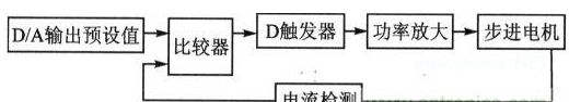 圖3為自激式恒電流斬波驅(qū)動(dòng)框圖。把步進(jìn)電機(jī)繞組電流值轉(zhuǎn)化為一定比例的電壓,與D/A轉(zhuǎn)換器輸出的預(yù)設(shè)值進(jìn)行比較,控制功率管的開關(guān),從而達(dá)到控 制繞組相電流的目的。從理論上講,自激式恒電流斬波驅(qū)動(dòng)可以將電機(jī)繞組的電流控制在某一恒定值。但由于斬波頻率是可變的,會(huì)使繞組激起很高的浪涌電壓,因 而對控制電路產(chǎn)生很大的干擾,容易產(chǎn)生振蕩,可靠性大大降低。
