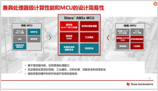 下圖可以看出,Sitara™ AM2x 具備MPU的高性能內(nèi)核,可實現(xiàn)更高的處理能力,另外在邊緣端實現(xiàn)實時控制、工業(yè)通訊、分析處理、功能安全和信息安全,借助TI簡易的硬軟件工程師可快速開發(fā)高性能系統(tǒng),降低系統(tǒng)總體設(shè)計復(fù)雜性和成本,并輕松獲得高性能處理能力。