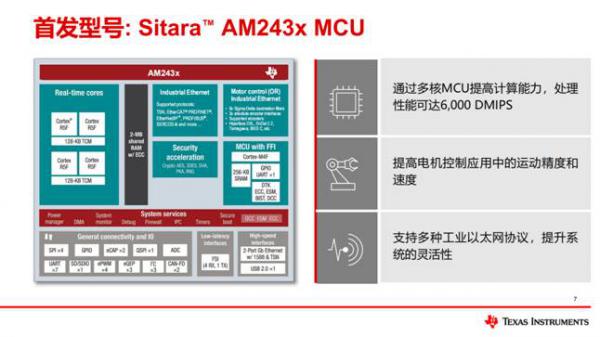 Sitara™ AM243x MCU首發(fā)型號AM2431、AM2432 和 AM2434,師總解釋說,這些型號末尾數(shù)字分別代表單核、雙核和四核。僅單核就高達800MHz的運行頻率,四核的處理性能可達6000DMIPS,且保證功耗小于1w,這便可使工廠運營商能夠延長電源壽命,并降低運營成本和能耗。師總稱,這種高實時處理速度在機器人等工廠設(shè)備中至關(guān)重要,其中快速計算能力與MCU內(nèi)部存儲器的高速訪問可同時幫助提高機器人的運動精度和運動速度,從而提高生產(chǎn)率。額外的處理能力使設(shè)計人員能夠進一步分析預(yù)測性維護等功能,從而減少工廠車間的停機時間。