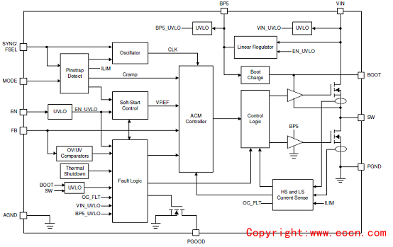 • Five selectable switching frequencies: 500 kHz,750 kHz, 1 MHz, 1.5 MHz, and 2.2 MHz