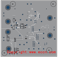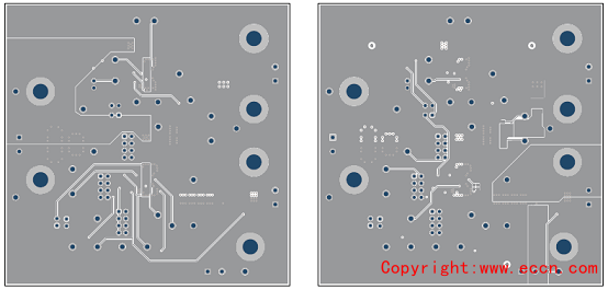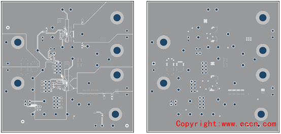 圖11.評估模塊TPS543620EVM PCB設(shè)計圖:左:中2層布局;右:底層布局