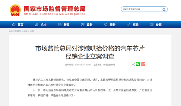 據(jù)市場監(jiān)管總局8月3日發(fā)布消息,針對汽車芯片市場哄抬炒作、價格高企等突出問題,近日,市場監(jiān)管總局根據(jù)價格監(jiān)測和舉報線索,對涉嫌哄抬價格的汽車芯片經(jīng)銷企業(yè)立案調(diào)查。