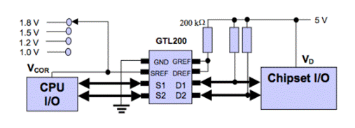 對(duì)于雙向轉(zhuǎn)換,GTL-TVC設(shè)備兩側(cè)的驅(qū)動(dòng)器必須是開(kāi)漏輸出,或者至少必須以這樣的方式控制它們:一側(cè)的輸出驅(qū)動(dòng)器上的高電平與低電平之間的爭(zhēng)用防止另一側(cè)的輸出驅(qū)動(dòng)器上的電壓過(guò)高。最簡(jiǎn)單的解決方案是使用漏極開(kāi)路設(shè)備(標(biāo)準(zhǔn)GTL和I2 C / SMBus輸出是漏極開(kāi)路輸出)。