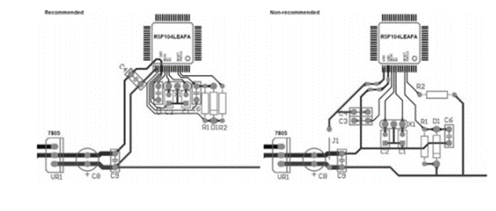 旁路電容器。推薦板上的旁路電容器C4比非推薦板上的電容器更靠近MCU。并且從旁路電容器到MCU的布線比不推薦的布線短。特別是在非推薦板上,C4的引線沒有直接連接到VDD和VSS干線。 |