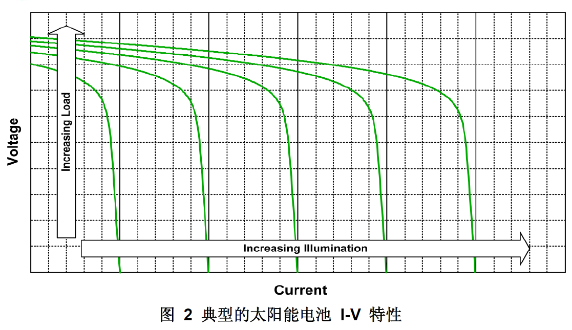 電流源IPH會(huì)產(chǎn)生一個(gè)和太陽能電池上的光量度成正比的電流。在沒有負(fù)載連接的情況下,幾乎所有產(chǎn)生的電流均流經(jīng)二極管D1,其正向電壓決定了太陽能電池的開路電壓(VOC)。該電壓會(huì)因不同類型太陽能電池的特性不同而有所差異,但是,對(duì)于大多數(shù)硅電池而言,這一電壓都在0.5V~0.6V之間(這也是p-n結(jié)二極管的標(biāo)準(zhǔn)正向電壓)。在實(shí)際太陽能電池應(yīng)用中,并聯(lián)電阻RP的漏電流很小。隨著負(fù)載電流的增加,IPH產(chǎn)生的大部分電流從二極管中流出來并進(jìn)入負(fù)載。對(duì)于大多數(shù)負(fù)載電流而言,這個(gè)過程對(duì)于輸出電壓僅有很小的影響。由于二極管的I-V特性會(huì)有輕微的變化,并且由于串聯(lián)電阻RS的原因(其具有連接損耗)電壓會(huì)稍有下降,但輸出電壓卻保持大體恒定。然而,有時(shí)流經(jīng)D1的電流太小,從而導(dǎo)致二極管偏置不夠,并且二極管兩端的電壓會(huì)隨著負(fù)載電流的增加而急劇下降。最后,如果所有產(chǎn)生的電流均只流經(jīng)負(fù)載(而不流經(jīng)二極管),則輸出電壓就會(huì)變?yōu)榱。這個(gè)電流被稱為太陽能電池的短路電流(ISC)。ISC和VOC都是定義太陽能電池工作性能的主要參數(shù)之一。