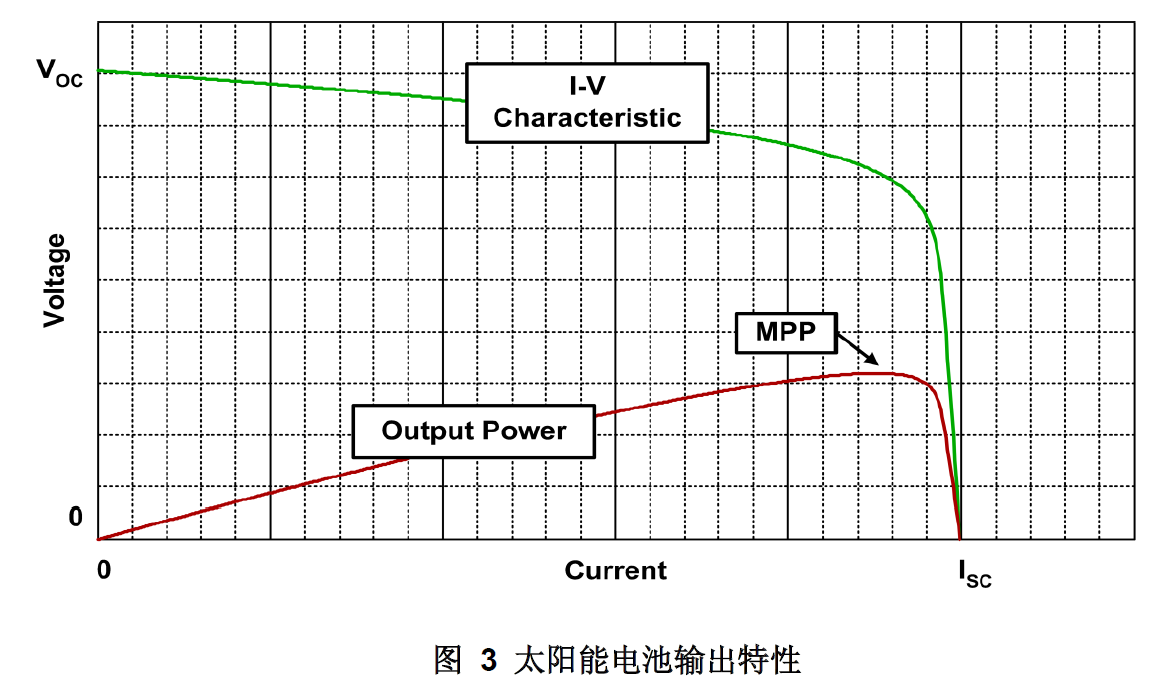 在大多數(shù)應(yīng)用中,人們都期望太陽能電池能提供盡可能多的電能。由于輸出功率是輸出電壓和電流的乘積,因此就必須確定電池工作區(qū)域中的哪一部分所產(chǎn)生的VI值最大。這一點(diǎn)被稱為最大功率點(diǎn)(MPP)。當(dāng)輸出電壓為其最大數(shù)值(VOC)時(shí),輸出電流為零,這是一個(gè)極端情況;而當(dāng)輸出電流達(dá)到最大值(ISC),但輸出電壓為零時(shí),則是另一種極端情況。在這兩種情況下VI的乘積均為零,因此,這兩種極端情況肯定都不是MMP點(diǎn)。我們可以很容易證明(或通過實(shí)驗(yàn)進(jìn)行觀察),在任何應(yīng)用中,MPP一般會(huì)出現(xiàn)在太陽能電池輸出特性(請(qǐng)參見圖3)下半部分的某個(gè)位置。但問題是太陽能電池MPP的確切位置會(huì)因入射光線和環(huán)境溫度不同而變化。所以,設(shè)計(jì)旨在動(dòng)態(tài)地調(diào)節(jié)太陽能電池的輸出電流,以達(dá)到太陽能電量生成系統(tǒng)的最大化,以便在實(shí)際應(yīng)用中其能夠在MPP點(diǎn)或者其臨近點(diǎn)工作。