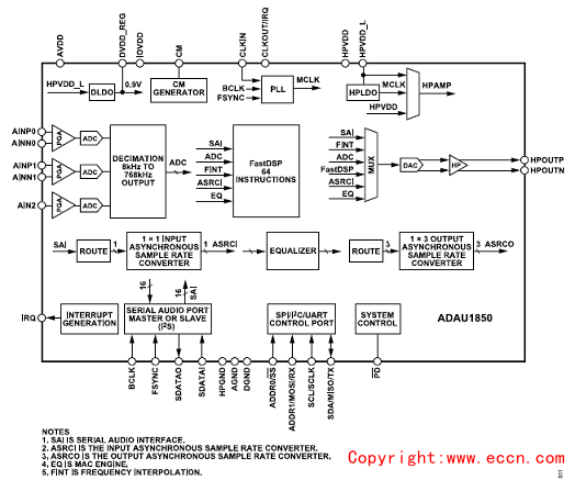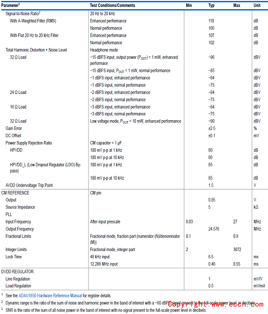 ADI公司的ADAU1850是具有三個輸入和一個輸出的集成了數(shù)字信號處理器的編譯碼器(CODEC).從模擬輸入到DSP核到模擬輸出的通路經(jīng)過優(yōu)化,具有低等待時間,非常適合于降噪音耳機(jī)使用.只需要增加少許無源元件, ADAU1850提供了完整的耳機(jī)解決方案. ADAU1850具有可編程的FastDSP音頻處理引擎,高達(dá)768kHz取樣速率,具有Biquad濾波器,限幅器,音量控制和混合等功能,低等待時間的24位ADC和DAC,106dB SNR(信號通過ADC和A加權(quán)濾波器),串口取樣速率從8kHz到768kHz,模擬到模擬群時延為5 μs,可編程雙精度MAC引擎用于13級均衡器,3個模擬輸入(2個差分和一個單端),可配置成麥克風(fēng)或線輸入.模擬差分風(fēng)音頻輸出,可配置成線路輸出或耳機(jī)驅(qū)動器,PLL支持30 kHz到27 MHz的任何輸入時鐘,1路ASRCI,三路ASRCO,串行音頻端口支持I2S,左對齊,或高達(dá)16路TDM (TDM16),具有靈活路經(jīng)的兩個插值器和4個抽取器.模擬AVDD電源電壓為1.8V.數(shù)字I/O IOVDD電壓為1.8V到3.3V.通信接口為I2C,SPI和UART.采用28點(diǎn)0.4mm間隔2.957 mm × 1.757 mm WLCSP封裝.主要用在降噪手機(jī)和耳機(jī),藍(lán)牙有源降噪(ANC)手機(jī)和耳機(jī),PND,數(shù)字照相機(jī)和攝影機(jī),樂器效果處理器,多媒體揚(yáng)聲器系統(tǒng)和智能手機(jī).本文介紹了ADAU1850主要特性,功能框圖和模擬性能指標(biāo),以及評估板EVALADAU1850EBZ主要特性,框圖,電路圖和材料清單.