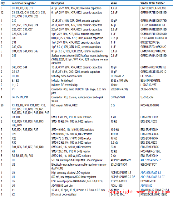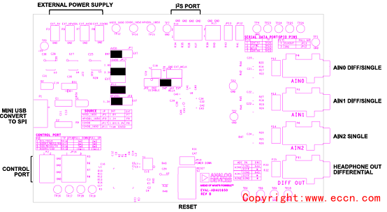 The EVAL-ADAU1850EBZ can be powered by the USB bus or bya single 3.8 V to 5 V supply. These supply options are regulatedto the voltages required on the EVAL-ADAU1850EBZ. The printedcircuit board (PCB) is a 4-layer design, with a ground plane anda power plane on the inner layers. The EVAL-ADAU1850EBZcontains connectors for external microphones and speakers. Themaster clock can be provided externally or by the on-board 24.576MHz oscillator.