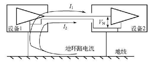3.當互聯(lián)設備處在較強的交變電磁場中時,根據(jù)電磁感應定律,交變磁場會在這個回路中產(chǎn)生感應電壓V=l(dp/dt),l是回路的電感,p是磁通量。在這個電壓驅(qū)動下,在設備1-互聯(lián)電纜-設備2-地形成的環(huán)路中感應出環(huán)路電流,