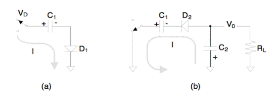 圖2說明了基本的二極管電荷泵。晶體管Q1和Q2代表CMOS反相器的輸出晶體管。當(dāng)反相器的輸入導(dǎo)致晶體管Q1導(dǎo)通(Q2截止)時,C1通過二極管D1充電至大約5 V的電壓減去二極管的正向電壓。當(dāng)逆變器的輸出切換為Q1斷開,Q2接通時,C1帶正電的導(dǎo)線將接地。由于電容器兩端的電壓不能瞬時改變,因此連接到二極管D2的C1的引線將變?yōu)樨?fù),從​​而導(dǎo)通二極管D2。C1上的電荷然后將流到C2上并產(chǎn)生負(fù)輸出電壓。電容器C2充當(dāng)電荷的儲存器,并且比電荷泵電容器C1大得多。在經(jīng)過數(shù)個電荷泵循環(huán)后,